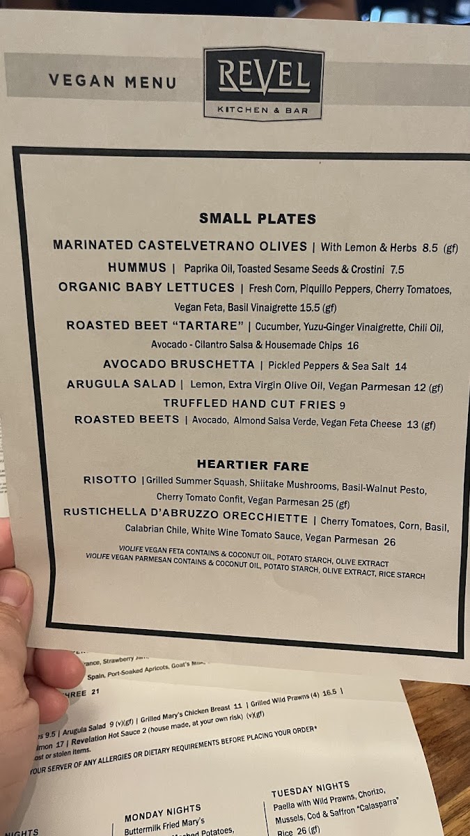 Vegetarian diners will find delight in the Truffled Fries, a heavenly blend of crispy fries generously tossed with white truffle oil, fresh parsley, and served with a garlic aioli that's undeniably addictive. The thoughtful options available ensure that every guest can find something to savor at Revel.